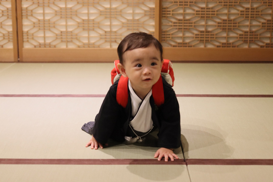 一升(約2kg)のお米でつくった丸いお餅を風呂敷やリュックに入れて背負わせ、「一生食べ物に困らず、健やかに円満に育ちますように」という願いを込めます。
